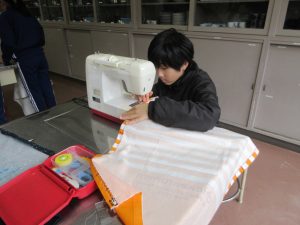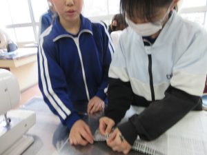 その5年生が今、家庭科でエプロンの製作をしています。説明書を見ながら、仲間と協力して作業を進めます。二人一組で一台のミシンを使えますので、待ち時間がない分作業がスムーズです。これも兼山の魅力!