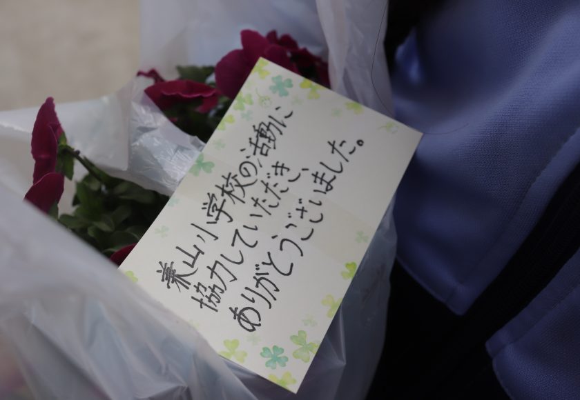 みんなでポットに植え、水やりを続け、大きく育てたビオラの花をプレゼントしました。