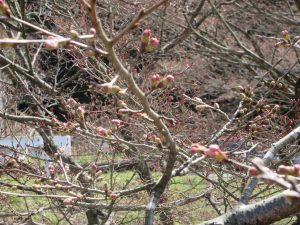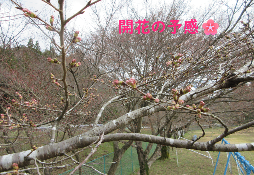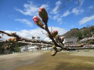 校庭の桜もつぼみのピンクでたくさんになりました。この三連休で開花しそうです。
