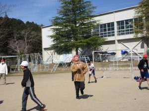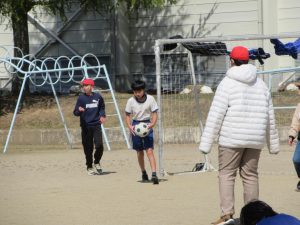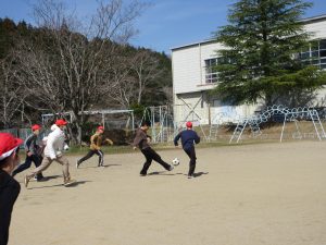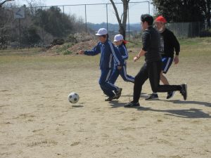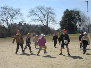 「最後の青空の時間、サッカーをやらせてください!」と。今日は特別日課でお昼休みがなく、ルールでは青空の時間はサッカーをしないことになっているため、この最終日にできないことがわかり、お願いがありました。みんなに、快くOKをもらい実現!普段、他の遊びをしている子や珍しい先生も参加し大人数で、今年度最後のサッカーを楽しみました。楽しい時間を6年生が作ってくれました。
