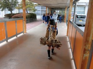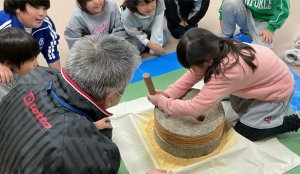 2月27日(金)に、昔のくらし体験を行いました。昔のくらしについてのお話や、「背負子(しょいこ)・洗濯・石臼」を使った体験をしました。初めて見る道具に興味をもち、話を聞いたり、体験を楽しんだりする姿が見られました。