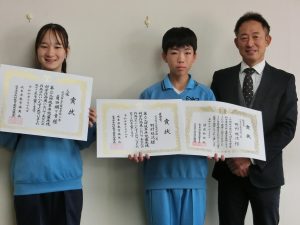 2年生の野村旺汰さんは第六十九回日本学生科学賞岐阜県審査委員会で優秀賞、第六十九回岐阜県児童生徒科学作品展で優秀賞に選ばれました。同じく2年生の角田瑚々音さんは第六十九回岐阜県児童生徒科学作品展で入選しました。