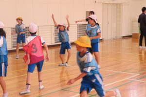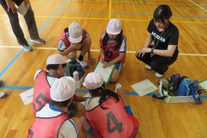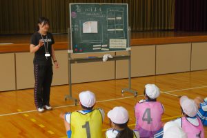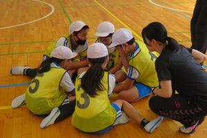 ハンドボールでシュートを打つためには、空いているスペースを作ってパスをつなぐとよいという内容でしたが、チームごとに作戦を考え、ゲームの中で実践していました。見事にパスが通って確実にシュートができた機会が何度かありました。