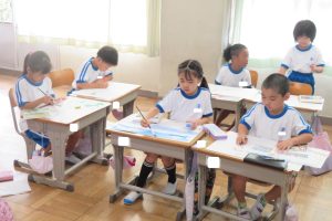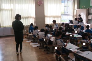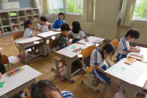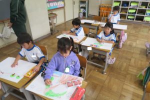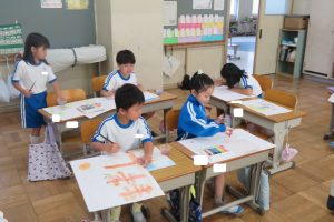 1年生では、お話の絵に取り組んでいました。国語で習った「やくそく」の話などから、イメージを膨らましていきます。
