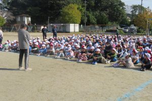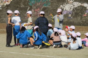 今日の5時間めは、屋外での全校集会の後、「縦割り活動」(異年齢集団活動)を行いました。
