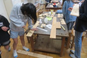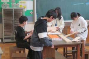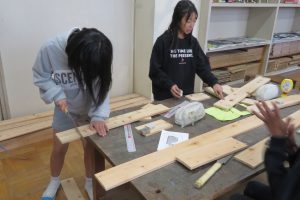 図工室から、ガンガンと音が聞こえてきたので、のぞいてみたところ、6年生が木材で作品を作っていました。
