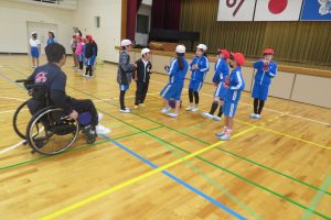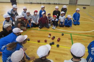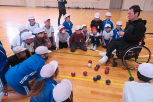 今日は、4年生が総合学習(福祉学習)で、パラスポーツ体験をしました。岐阜県の「ボッチャ」代表選手にお越しいただき、ルールの解説とゲーム体験をしていただきました。