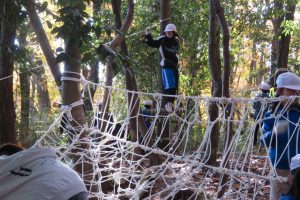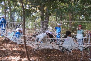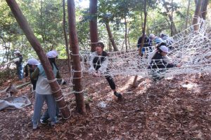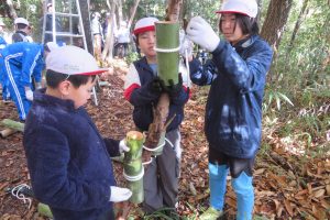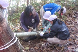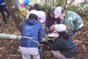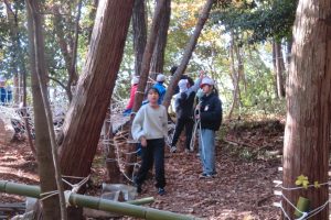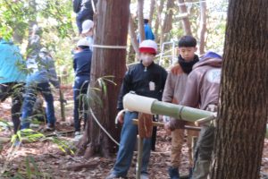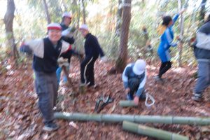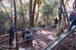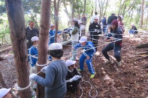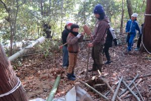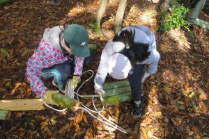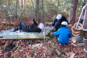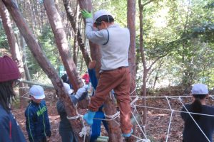 県の森林アカデミーの先生方(リーダーの「ナバ先生」ほか数名の先生方)にお越しいただき、木や竹、ロープワークを使って遊具を作成します。かなり本格的なものです。