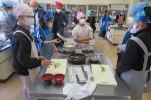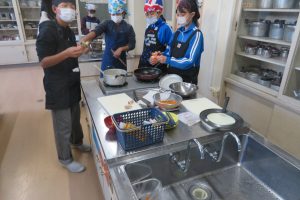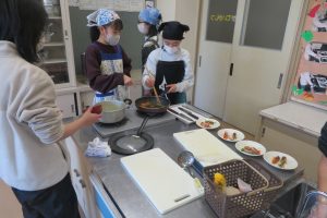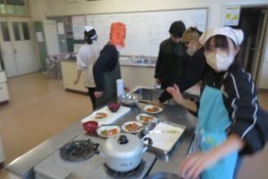野菜を下茹でし、ベーコンを巻いて、炒めます。とても手際よくてきていました。今までの学習の成果ですね。