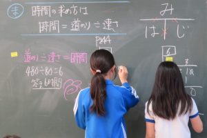 5年生算数では、時間・距離・速さの文章題にみんなで取り組んでいました。(みんなちょっと苦手なところです。)