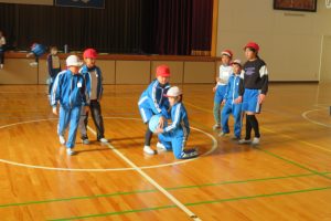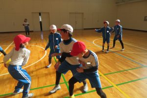 3年生では、ボール運動(バスケットボールをドリブル無しでやるイメージ)の試合形式が白熱していました。