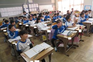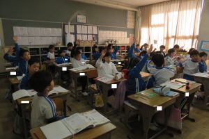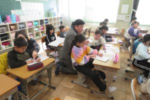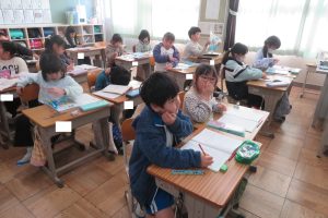 2年生では、「私は列の5番目」と「列の私の前に5人いる」の違いにちょっと困っている子がいました。手がかりを求めて、図に表して考えていました。教える側も一生懸命です。
