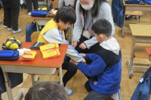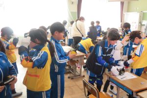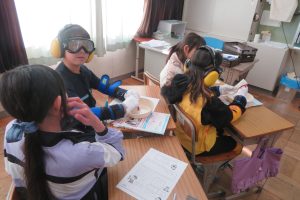 4年生総合学習で、先週に引き続き福祉学習を行い、高齢者疑似体験をしました。