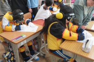 ペアで疑似体験グッズを取り付け、歩いたり会談を登ったり、細かい字を書いたりしてみました。