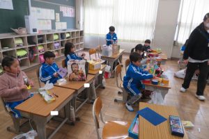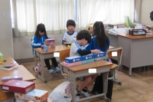図工で、箱を使って何かをつくっているそうです。まだ途中のようですが、一生懸命取り組んでいました。発想が豊かですね!