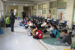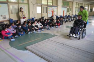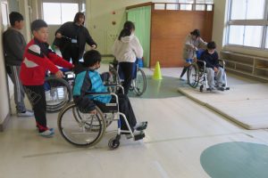 4年生総合の福祉学習で、さまざまな体験学習が続いていますが、今日は「車いす体験」を行いました。