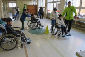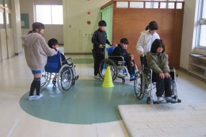 ペアになって、乗る側と押す側を交互に体験しました。マットを段差に見立てて、それを越えるようにしました。