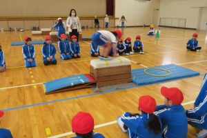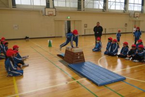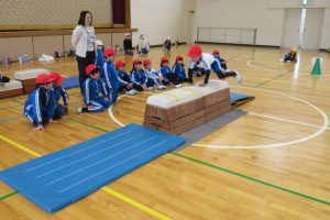多くの子が5種類とも跳べるようになりましたが、まだ4段の高さを跳びこえるのが苦手な子もいます。声を掛け合い、励ましあって練習しました。