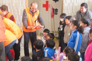 早速、1年生が見に来ました。三人官女や五人囃子などの人形の名前や、どんなものが飾ってあるのかを教わっていました。みんな嬉しそうでした。
