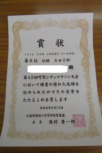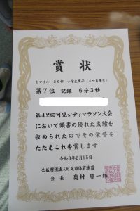 男子小学校4~6年生の部で6位と7位、女子小学生4~6年生の部で8位でした。(距離1マイル(1609m):タイムは写真をご覧ください)トレーニングを積んで参加したとのことです。努力の成果ですね。おめでとうございます。