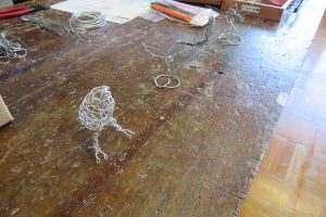 アルミの柔らかい針金をラジオペンチで曲げたり、より合わせたりしながら、立体を作っていきます。