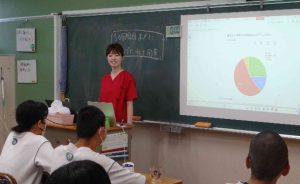 歯科衛生士の鈴木 利奈子先生を中心に、生徒からの歯に関する事前アンケート結果を基に口腔ケアの大切さや実際の歯ブラシの動かし方などを丁寧に教えていただきました。