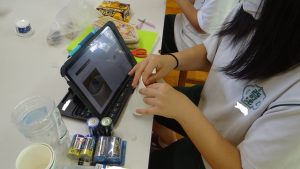 本日のⅠ時間目、被服室をのぞいてみると、3年生の生徒が何だかグループでわいわい言いながら、工作をしていました。