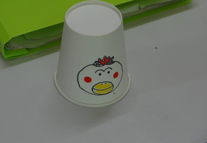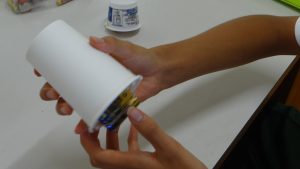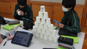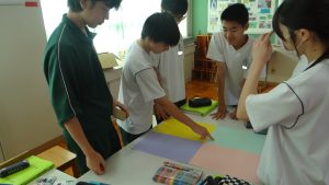 聞いてみると、10月末に保育実習に行くそうで、そのためのおもちゃ作りをしていました。ボーリングゲームや紙コップのころころおもちゃ、コップつみなど楽しいおもちゃを作っていました。「これかわいい!」とか、「楽しそう!」など3年生生徒たちは、幼稚園の子たちがどんなことをしたら喜びそうなのか想像しながら、作っていました。