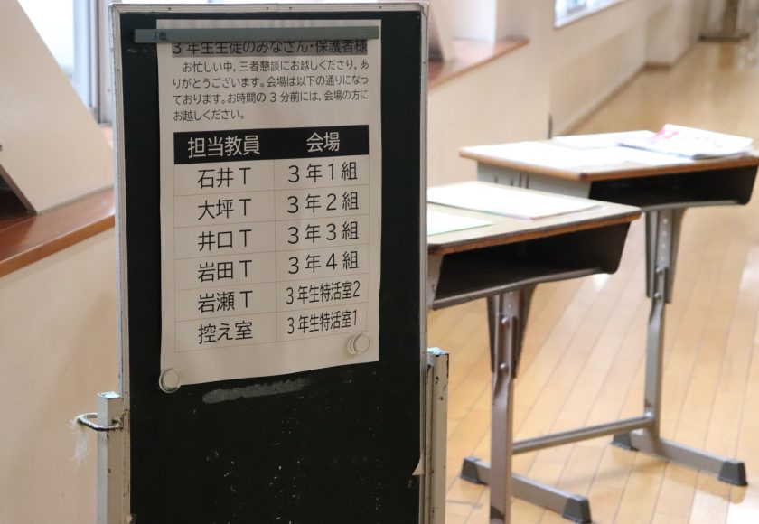 三者懇談では、前期の学校での様子や後期に向けての展望、進路などの話題を中心に話し合います。