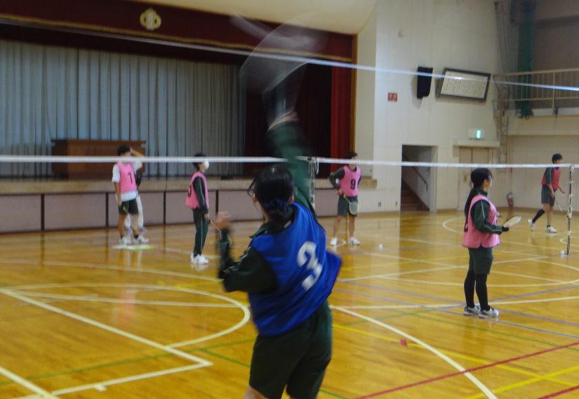 本日5時間目、体育科の全校授業研究会が行われました。これは、先生方が授業を参観して、互いの授業力を磨くものです。今回は、3年生の石井先生が体育の「バトミントン」の授業提供をしていただきました。課題は「ハイクリア」です。ハイクリアとは、シャトルを高く遠く飛ばすショットです。それを身につけるために本時の授業が仕組まれました。