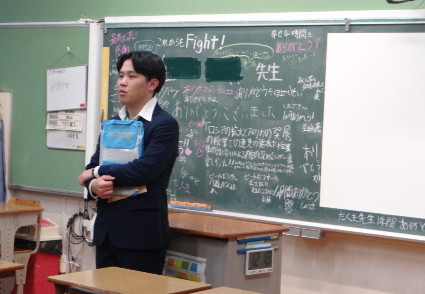 本日で教職プラクティス(教育実習)が終了しました。この4週間、教員の卵として学校生活の中で時には生徒たちと身近に接したり、教員として、授業を参観したり、実際に授業を行ったりしながら、充実した時を過ごしてきました。