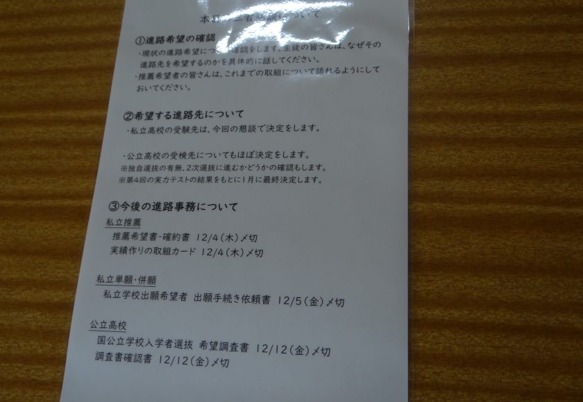 本校では、11月27日~12月3日まで、三者懇談、二者懇談が行われています。3年生は、進路を中心に三者で懇談をしております。1.2年生については、担任と生徒の二者懇談を行っております。