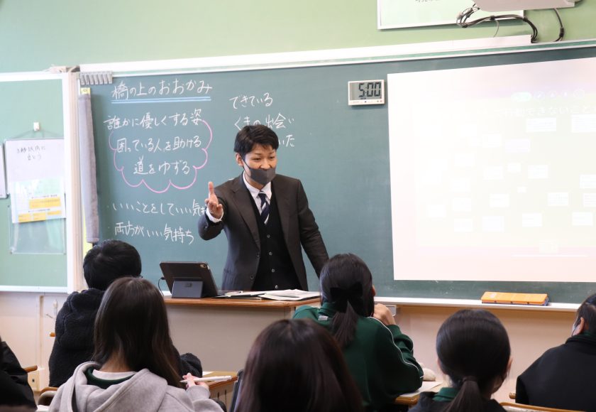 1年3組の道徳の授業は、小学校でも考えたことのある「橋の上のおおかみ」でした。「思いやり」について考える中で、「最初、自分は周りの様子を見て意見を書いていたけど、自分の思いを書いている仲間を見て、自分の考えを貫きたいという思いで意見を変えた。」という生徒の姿に感動しました。まさに仲間と協働的に学ぶ姿でした。