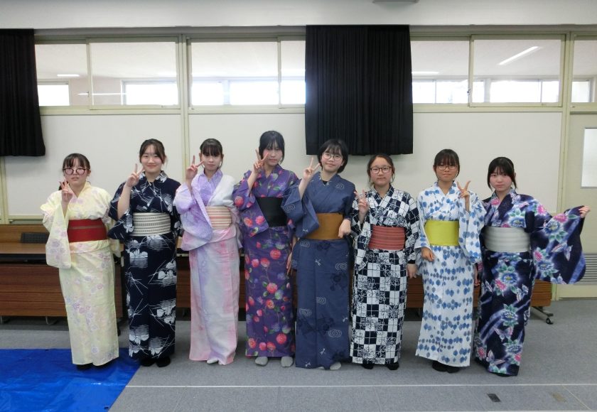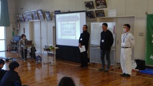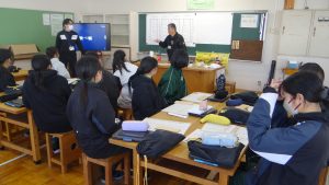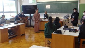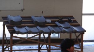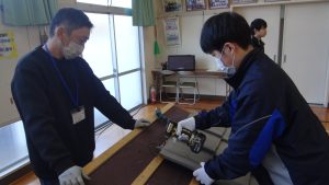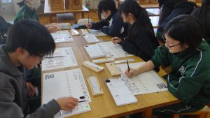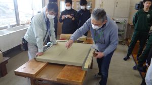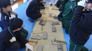 さまざまな職種の方がみえました。「かわらぶき」「広告美術仕上げ」「畳制作」「和裁」など興味深い活動を行っていました。例えば、かわらぶきであれば、かわら割りや瓦並べを行っていたり、広告仕上げは筆を使ってレタリングをしたり、畳制作は実際に畳に針で糸を通したり、和裁では、小物づくりと着付け体験を行っていたりしながら、生徒たちは初めてする体験に興味をもって取り組んでいました。