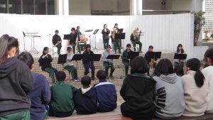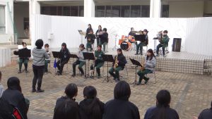 昨日の昼休み、中庭にて吹奏楽部のライブが行われました。今回は、1,2年生で初めての中庭でのライブになりました。曲は、エヴァンゲリオンのテーマ曲とディズニーの「アラジン」のメドレーでした。