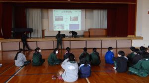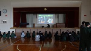 それぞれのテーマをクラスごとに動画や写真等でわかりやすく伝えていきます。今日は体育館でリハーサルをし、その後クラスごとに教室に戻って振り返りを行いました。「ここは吹き出しを入れた方が伝わると思う。」「ここは音が大きすぎる!もっと小さくした方が良い。」など、どうしたら在校生にもっとわかりやすく伝わるのかを考えました。