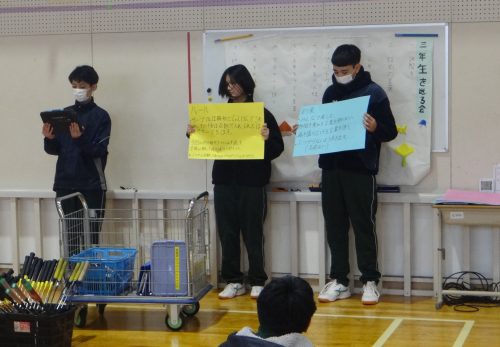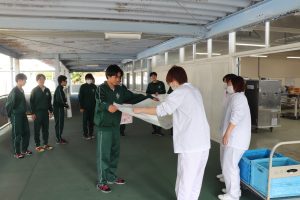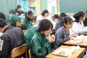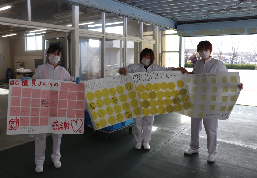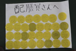 健康委員の宮崎さんからは、全校を代表して感謝とともに、「これからも健康に、美味しい給食をお願いします!」と伝え、配膳員代表の田口さんからは「卒業しても頑張ってください」と励ましのお言葉をいただきました。