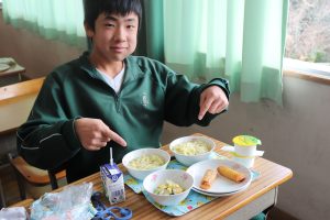 今日の給食は塩ラーメン、春巻き、中華サラダ、ゼリー、牛乳。温かいものは温かく、冷たいものは冷たい状態で、今日も美味しくいただきました。やっぱりラーメンは大人気!