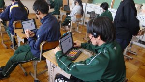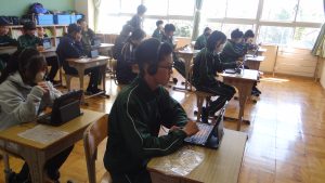 タブレットにヘッドセットを付け、装着。2年生の生徒達は、静かに先生の指示を聞き、取り組むことができました。今の時代はスピーキングしたものを送って採点していただけるようです。