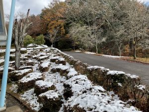 雪景色の岐阜市少年自然の家に到着。みんな元気です。