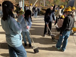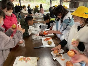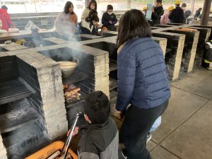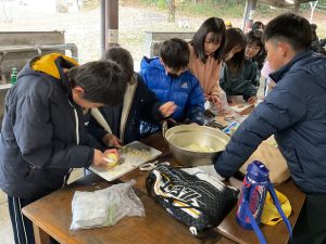 今は、野外炊事でカレー作り中です。かまどに鍋を置き、出来上がるのを待つだけ。
