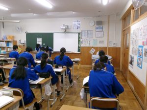 3年生の教室をのぞくと、流れるメロディーに耳を傾けながら、卒業合唱を真剣に選んでいる生徒たちの姿がありました。教室の前では、リーダーの生徒がみんなを支え、選曲の手助けをしています。