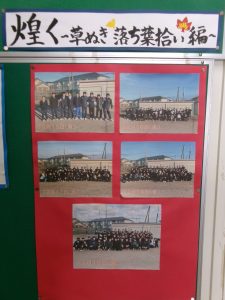 「草抜き・落ち葉拾い編」では、写真のように多くの生徒が参加していました。