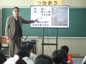 12月12日、市長さんを講師にお招きして、5年生が「可児市のじまんとほこり」について学びました。「加尓(かに)」「久々利」と書かれた木簡が見つかっており、今から1300年以上前から「カニ」という地名があったこと。美濃桃山陶や戦国時代の山城など、歴史や産業・自然・人物など、たくさんの可児市のよさを教えていただきました。