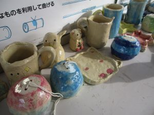 陶芸クラブでは、お皿や風鈴、コップなどを作って電気窯で焼いています。釉薬の濃さを調整したり、窯で焼成したりするのは、講師の先生にお世話になっています。