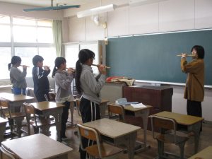横笛クラブでは、一人一人が安定した音が出せるように練習してきました。講師の先生から空気の入れ方のコツを教えていただき、4人ともとっても上達しました。