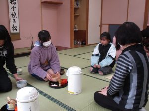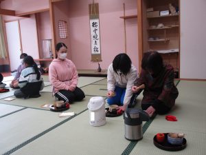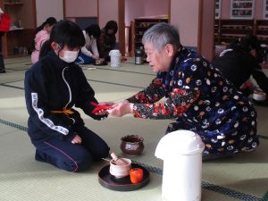 茶道クラブでは、お茶の飲み方やお点前の作法など、一人でできるように教えていただいています。3人の先生が来てくださり、丁寧に教えてくださっています。
