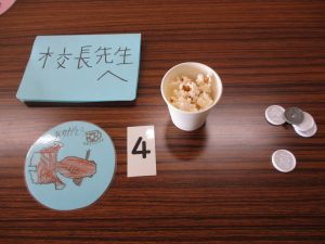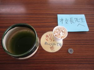 飲み物は、社会見学の時に購入して準備をしてくれました。さすがに東明小学校のカフェです。飲み物のメニューにお抹茶があり、注文を受けるとその場で点ててくれました。温かくて心がほっこりするうれしいお抹茶でした。