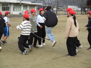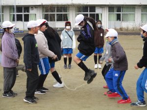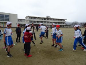 あいにく雪が降る天候となりましたが、どのチームも縄を回す子も跳ぶ子も、精一杯一定のリズムで回し、一定の速さで跳び続けました。見ている学年から「がんばれ!がんばれ!」